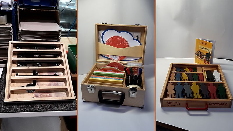 The employees at the OWB workshop produce, above all, products related to the subjects of modernization / presentation. This product line has been on sale for several years now at the OWB online shop. Among others they sell a modular kit for psychologist, the so-called Inszenario® set This is thoroughly tested, highly effective communication medium to help make fundamental, interpersonal psychological problems visible as an initial step in finding a solution. The range also includes a moderation case produced of native beechwood. All products are top grade and very popular.